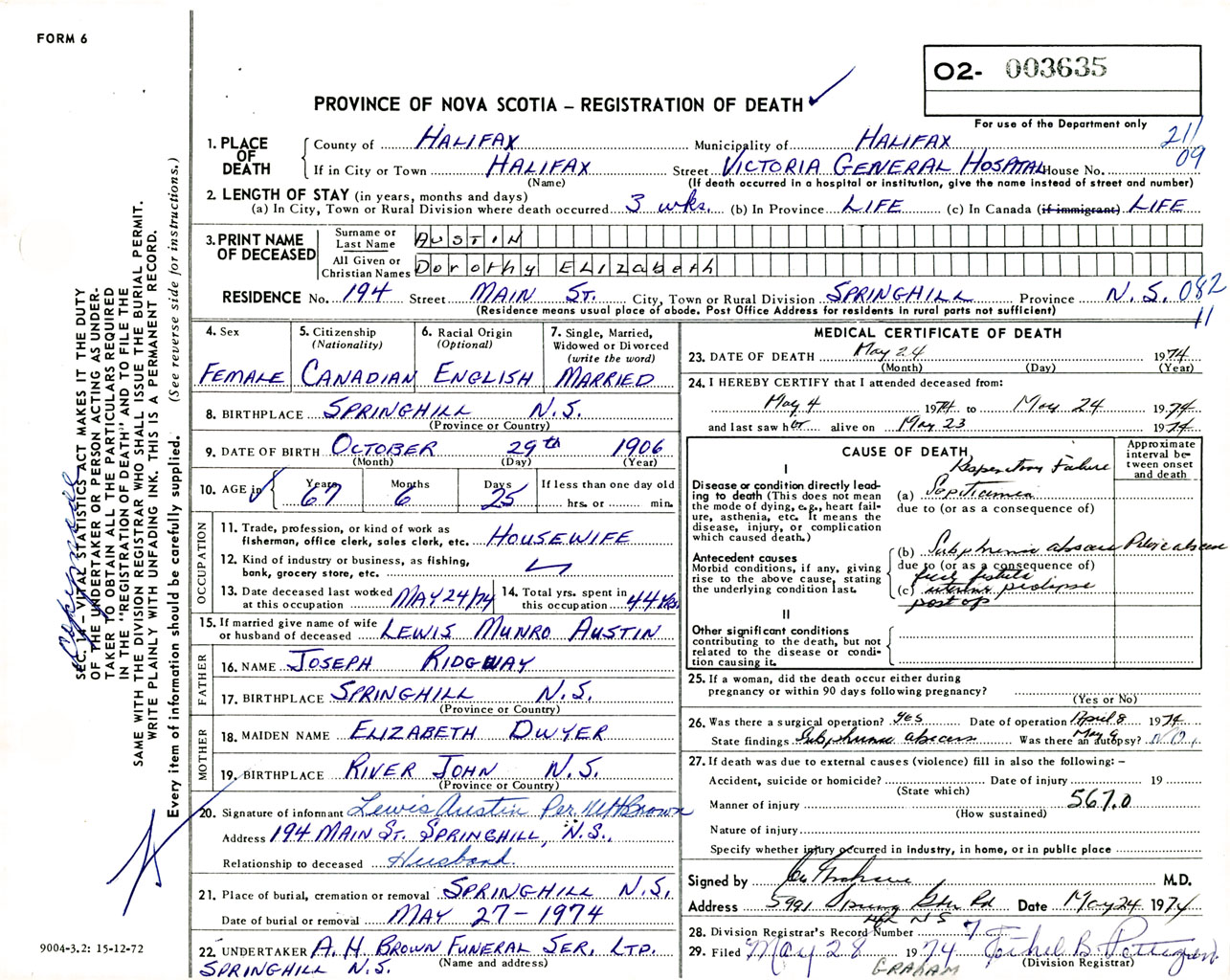 Female Death Registration: Year: 1974 number: 3635