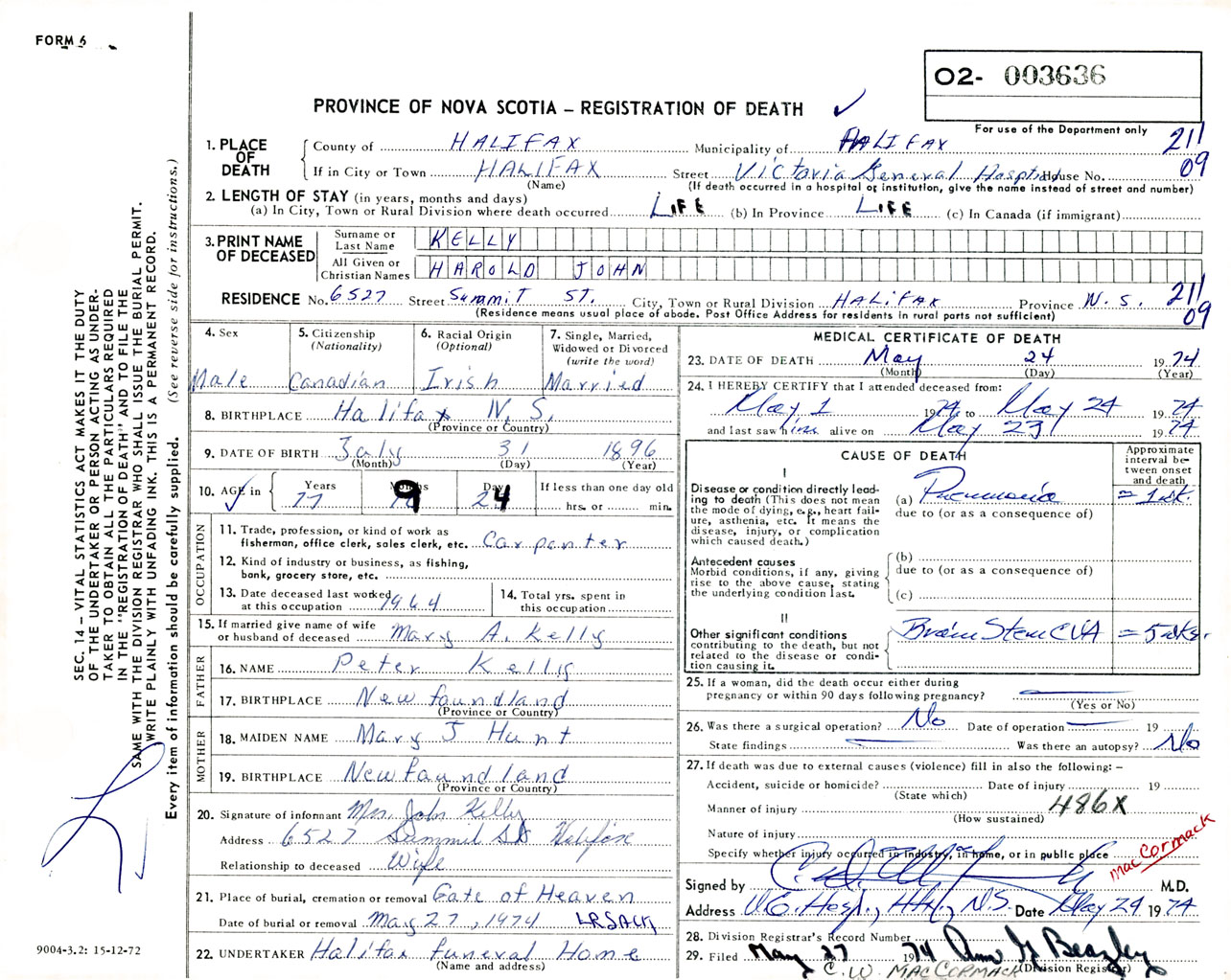 Male Death Registration: Year: 1974 number: 3636
