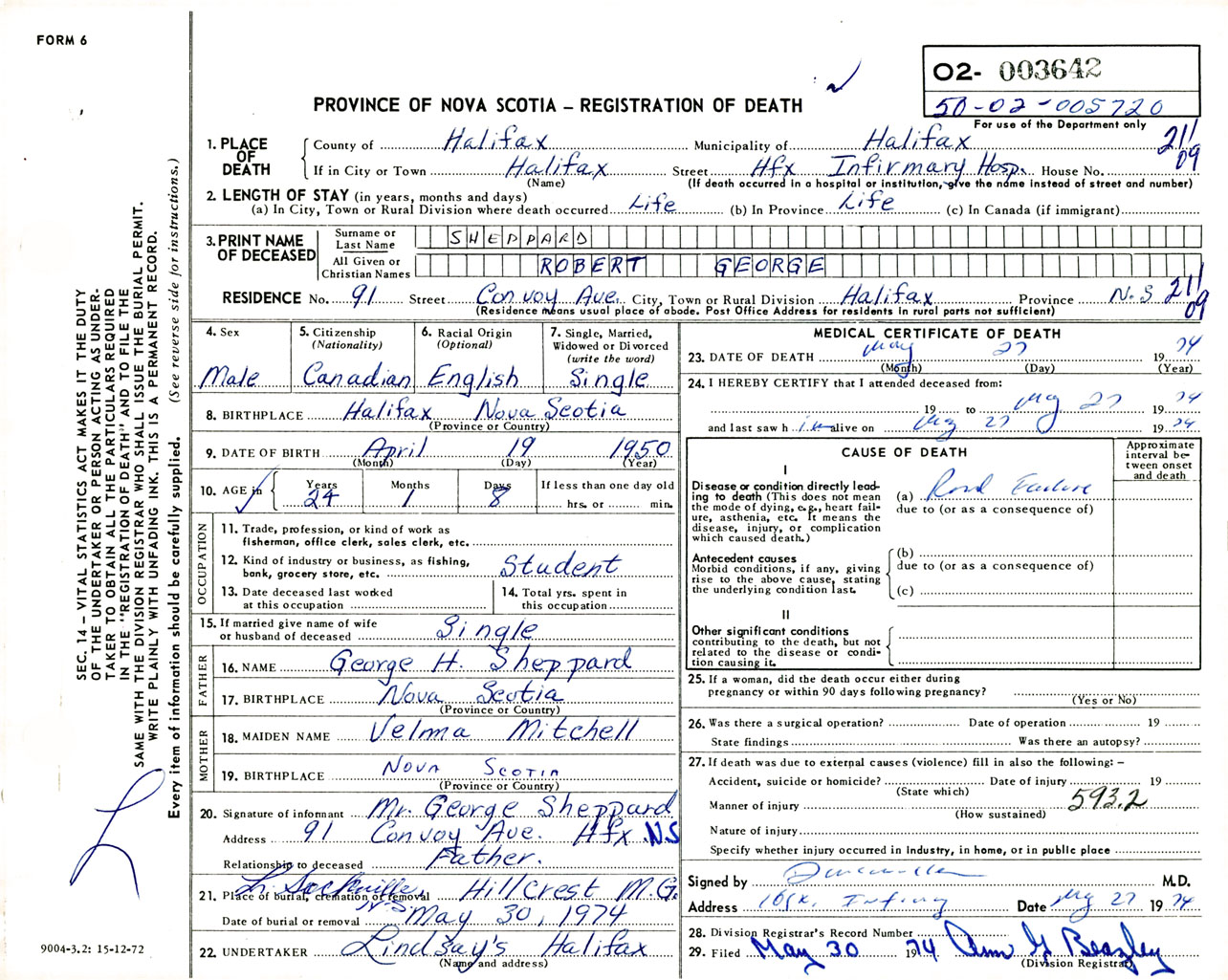 Male Death Registration: Year: 1974 number: 3642