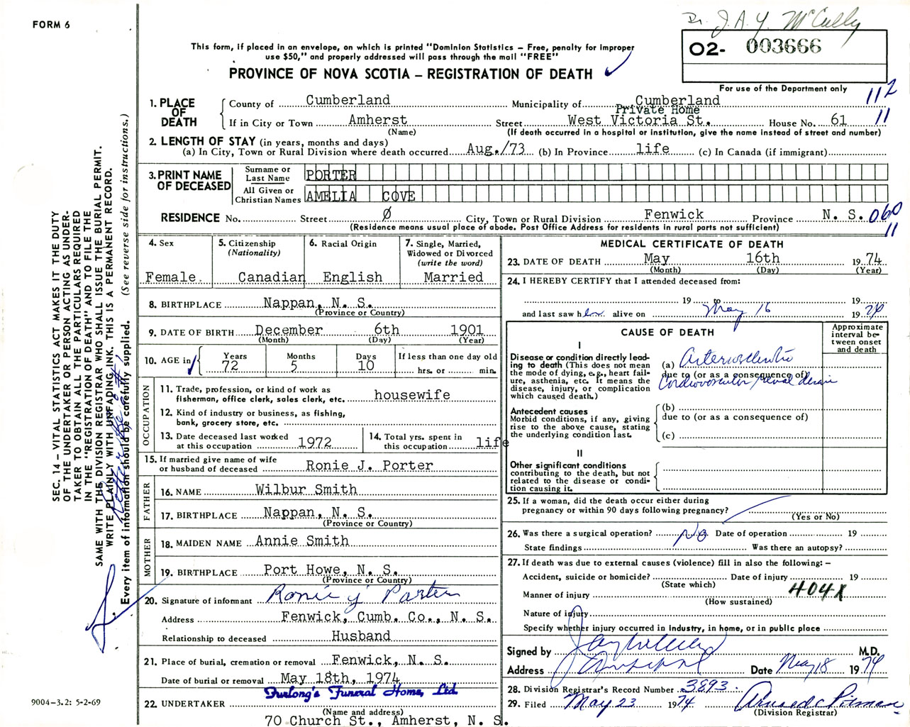 Female Death Registration: Year: 1974 number: 3666