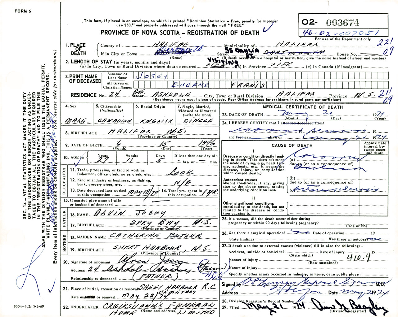 Male Death Registration: Year: 1974 number: 3674