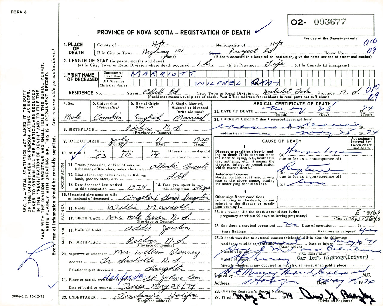 Male Death Registration: Year: 1974 number: 3677