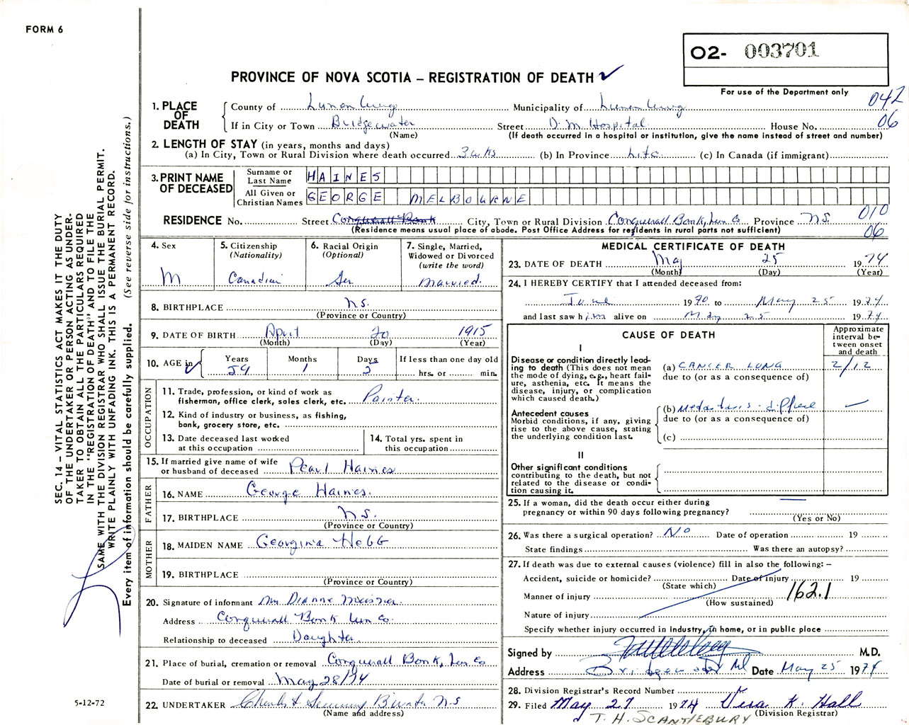 Male Death Registration: Year: 1974 number: 3701
