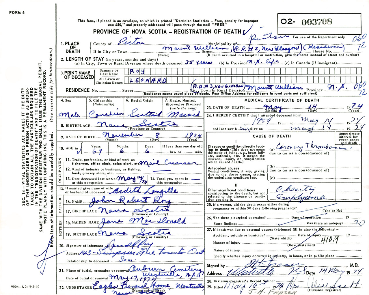Male Death Registration: Year: 1974 number: 3708