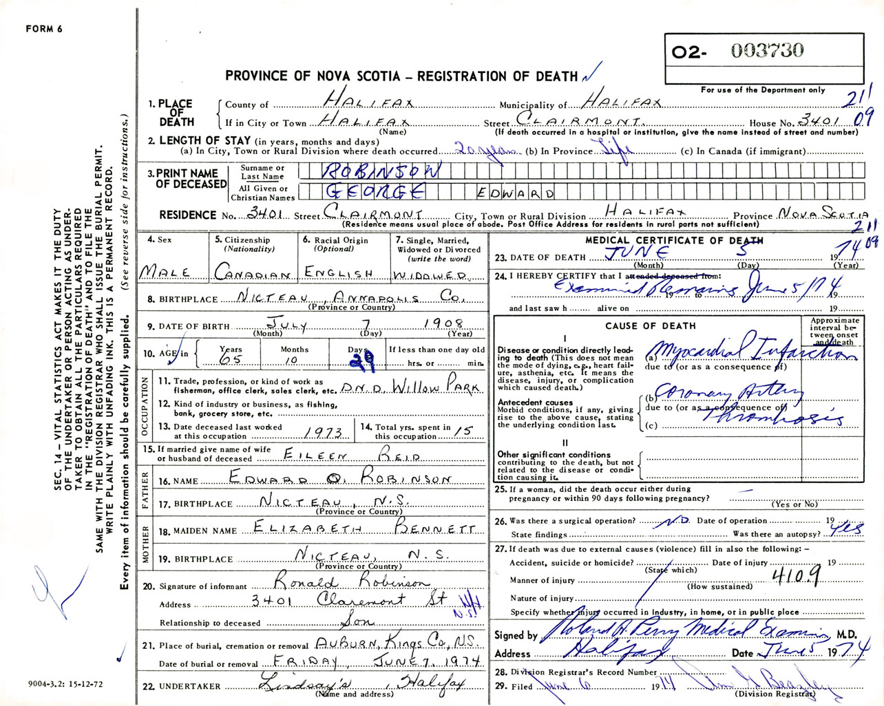 Male Death Registration: Year: 1974 number: 3730