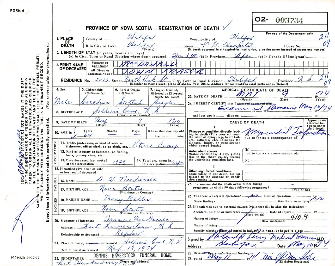 Male Death Registration: Year: 1974 number: 3734