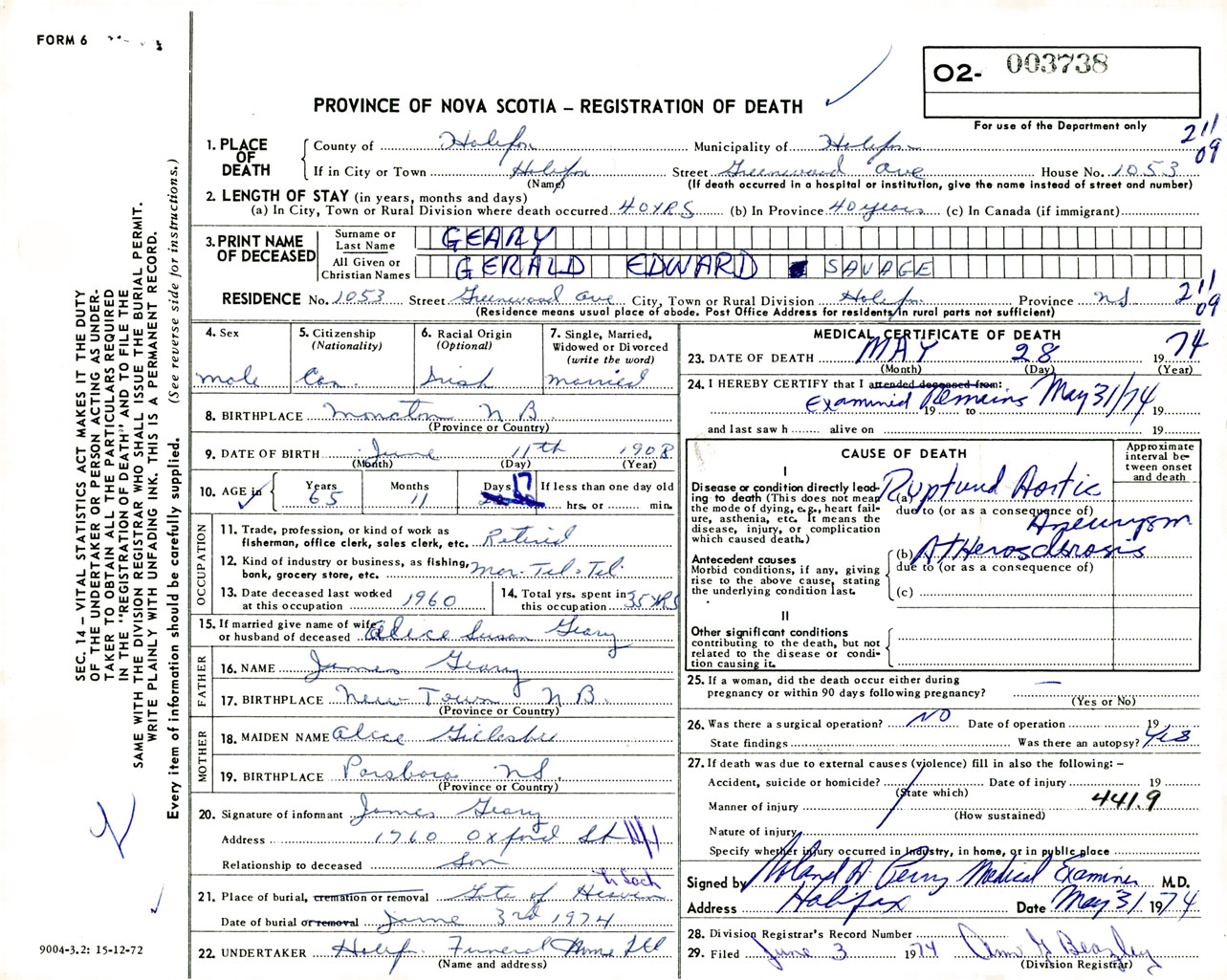 Male Death Registration: Year: 1974 number: 3738
