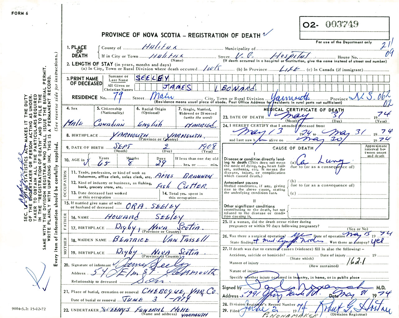 Male Death Registration: Year: 1974 number: 3749