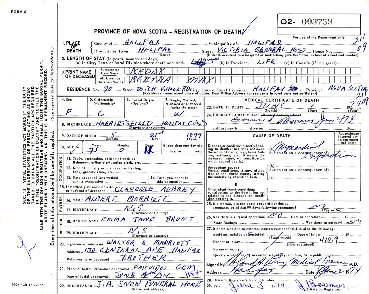 Female Death Registration: Year: 1974 number: 3759