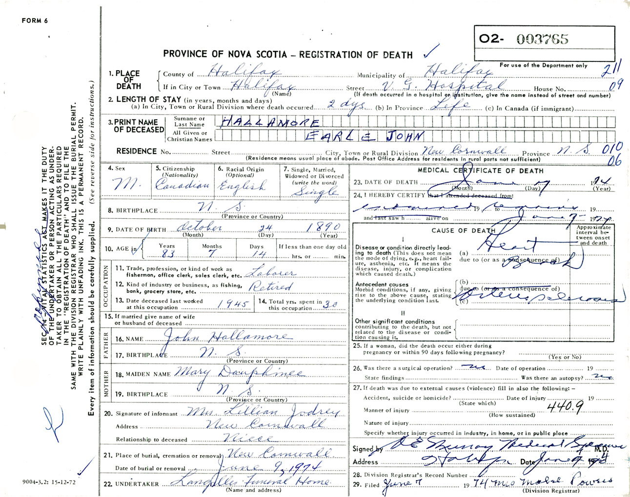 Male Death Registration: Year: 1974 number: 3765