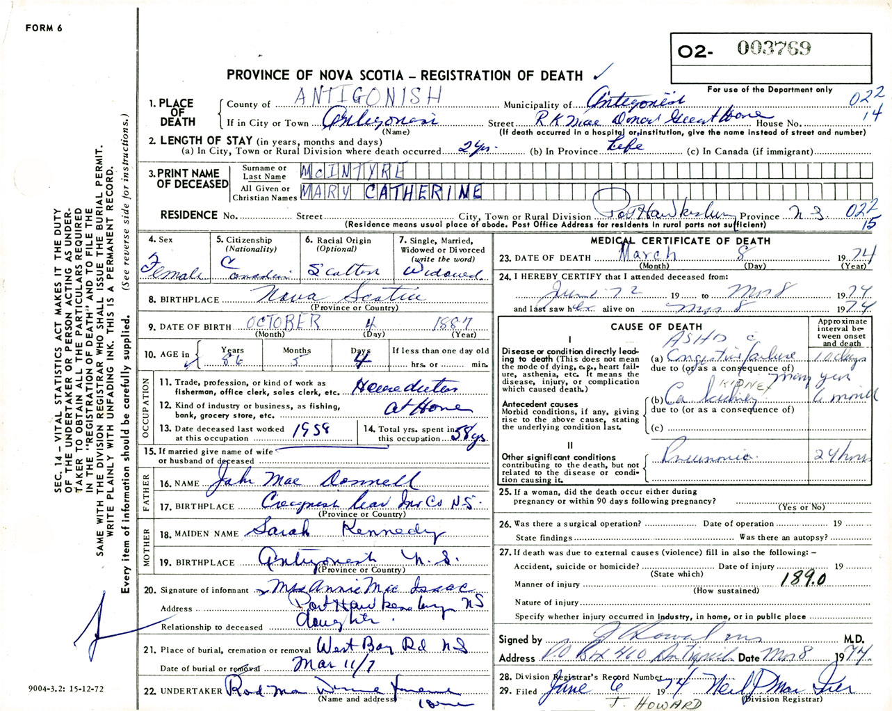 Female Death Registration: Year: 1974 number: 3769