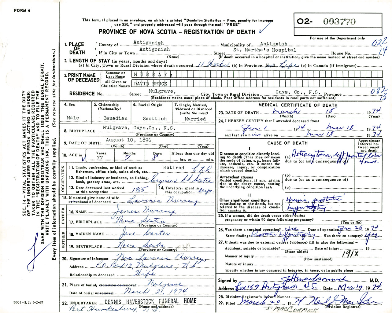 Male Death Registration: Year: 1974 number: 3770