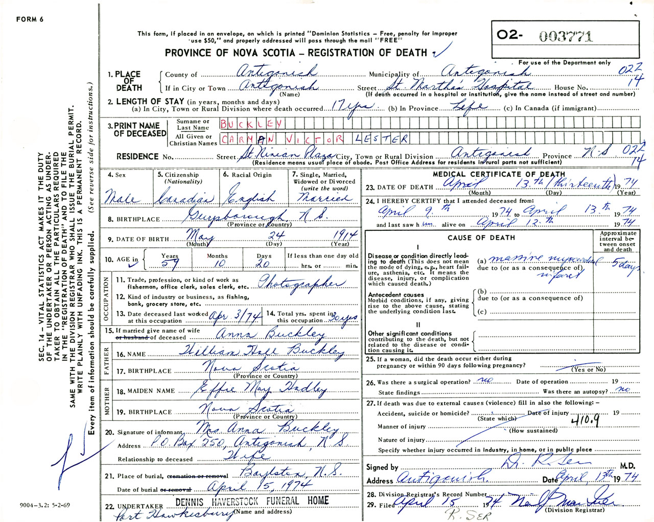 Male Death Registration: Year: 1974 number: 3771
