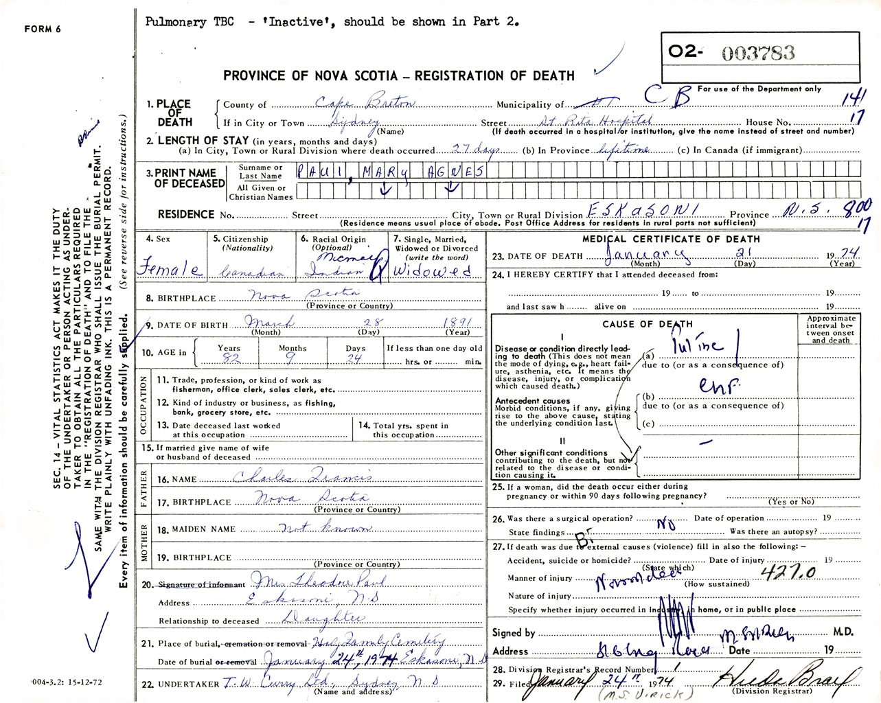 Female Death Registration: Year: 1974 number: 3783