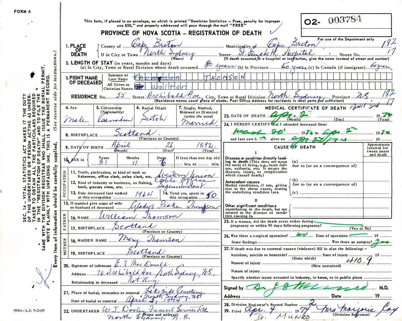 Male Death Registration: Year: 1974 number: 3784