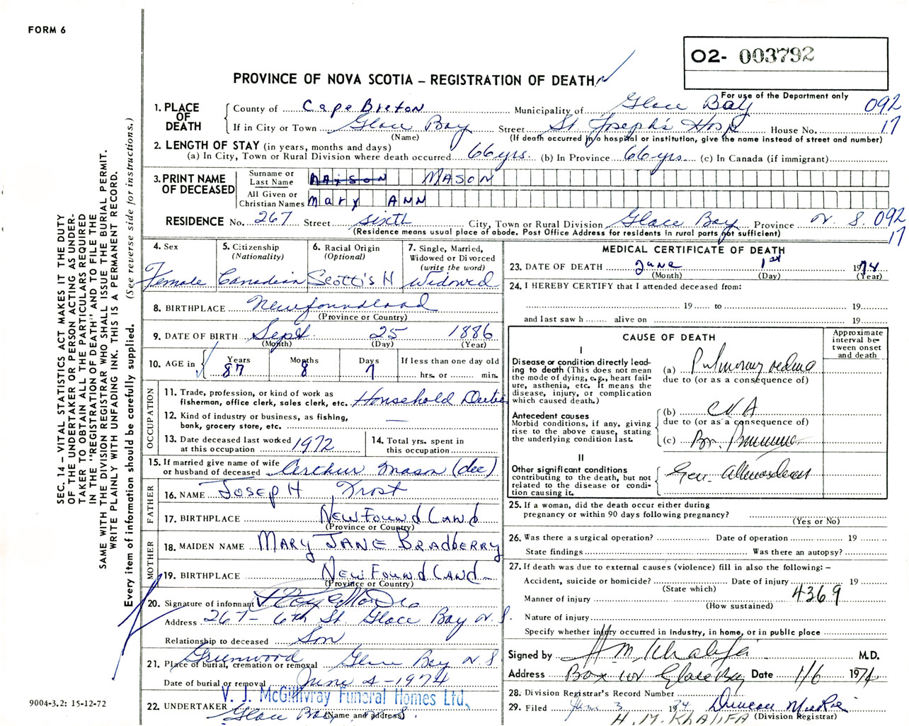 Female Death Registration: Year: 1974 number: 3792