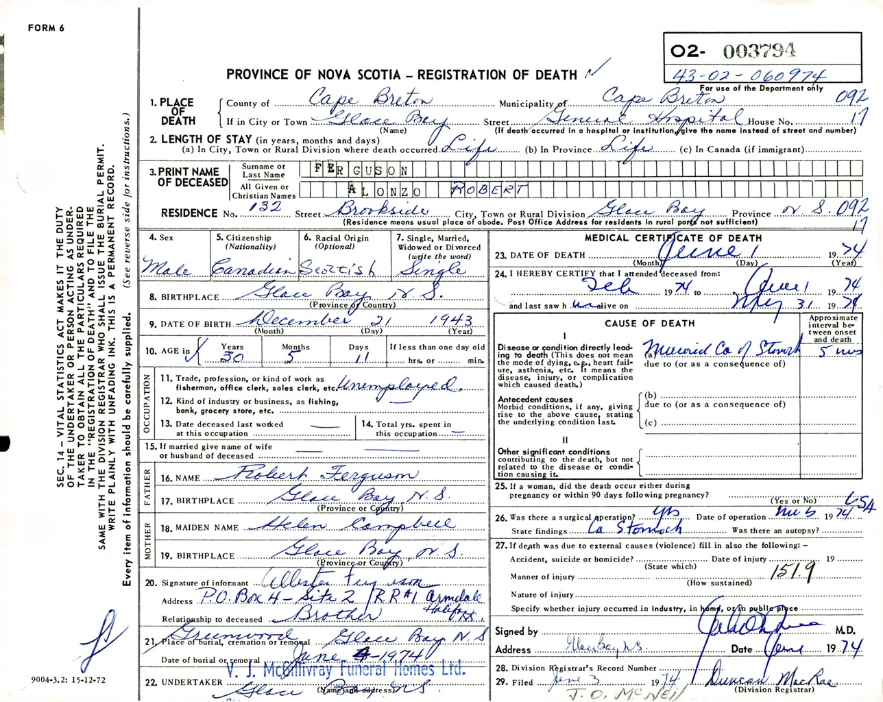 Male Death Registration: Year: 1974 number: 3794