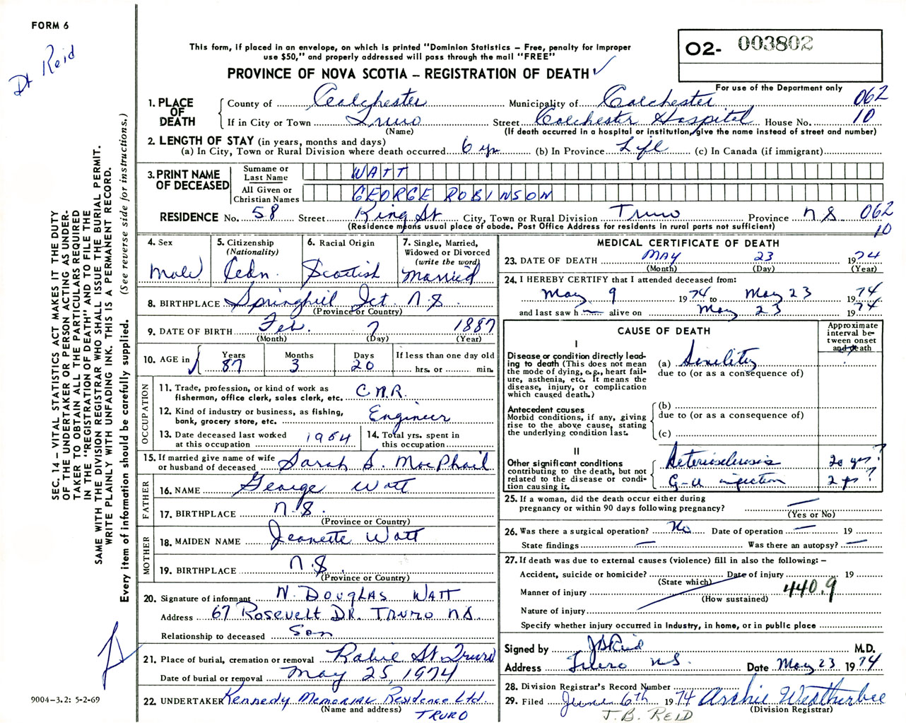 Male Death Registration: Year: 1974 number: 3802