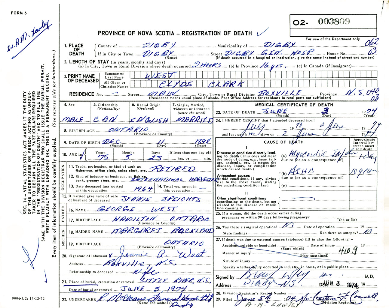 Male Death Registration: Year: 1974 number: 3809