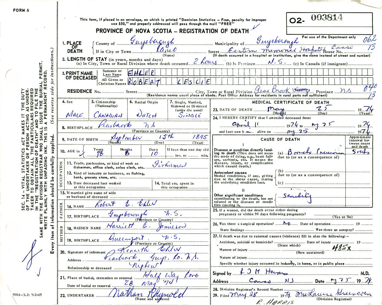 Male Death Registration: Year: 1974 number: 3814