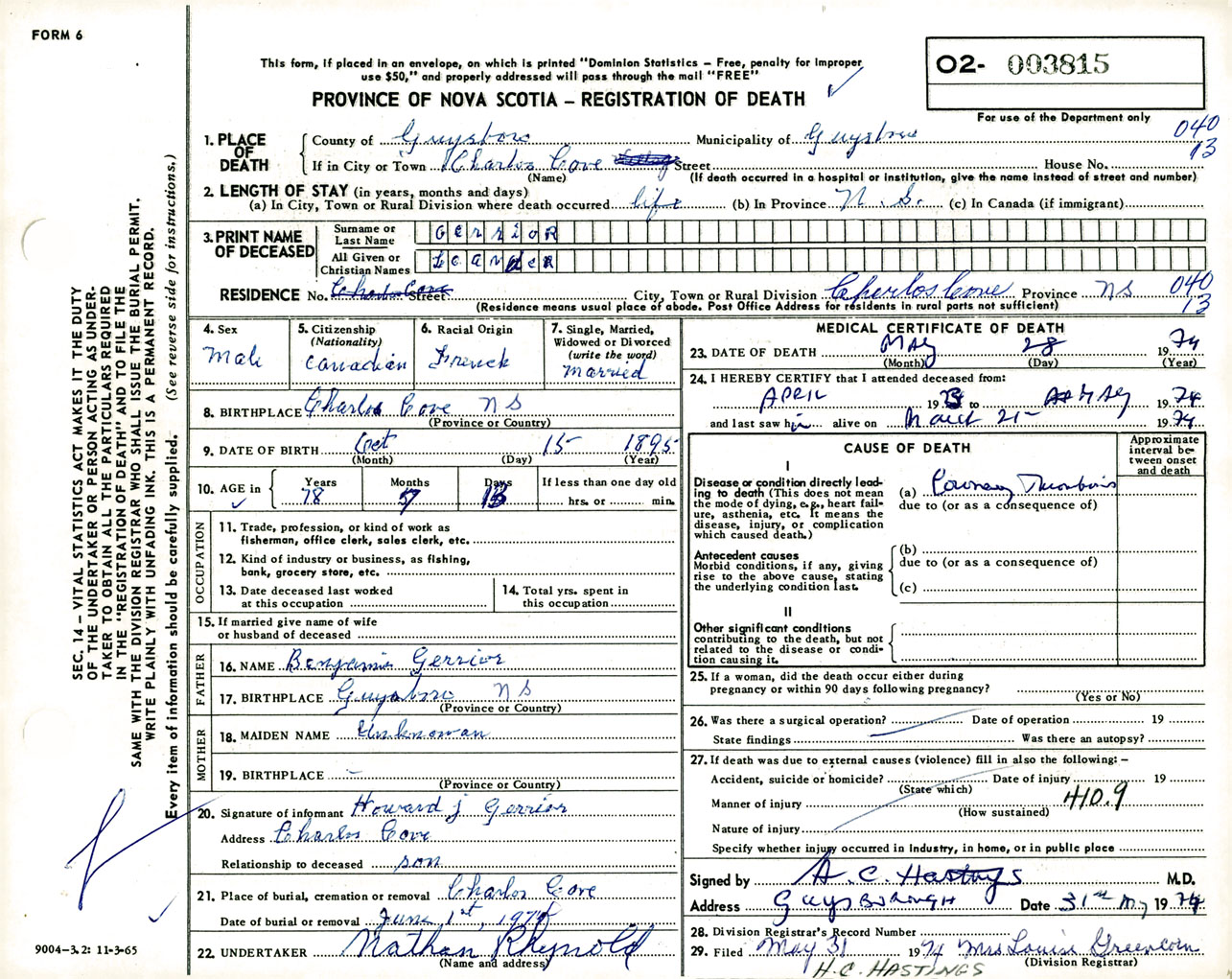 Male Death Registration: Year: 1974 number: 3815