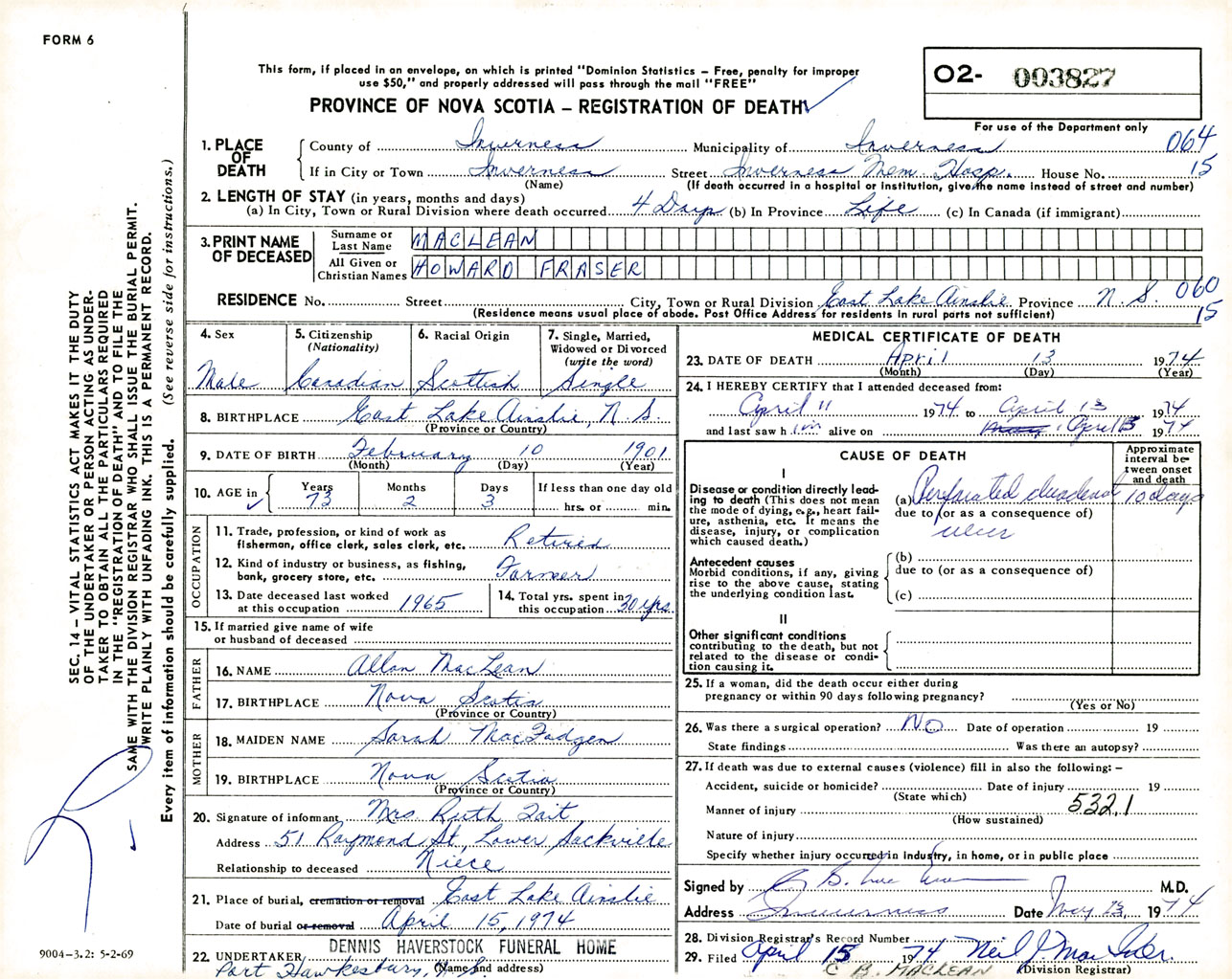 Male Death Registration: Year: 1974 number: 3827