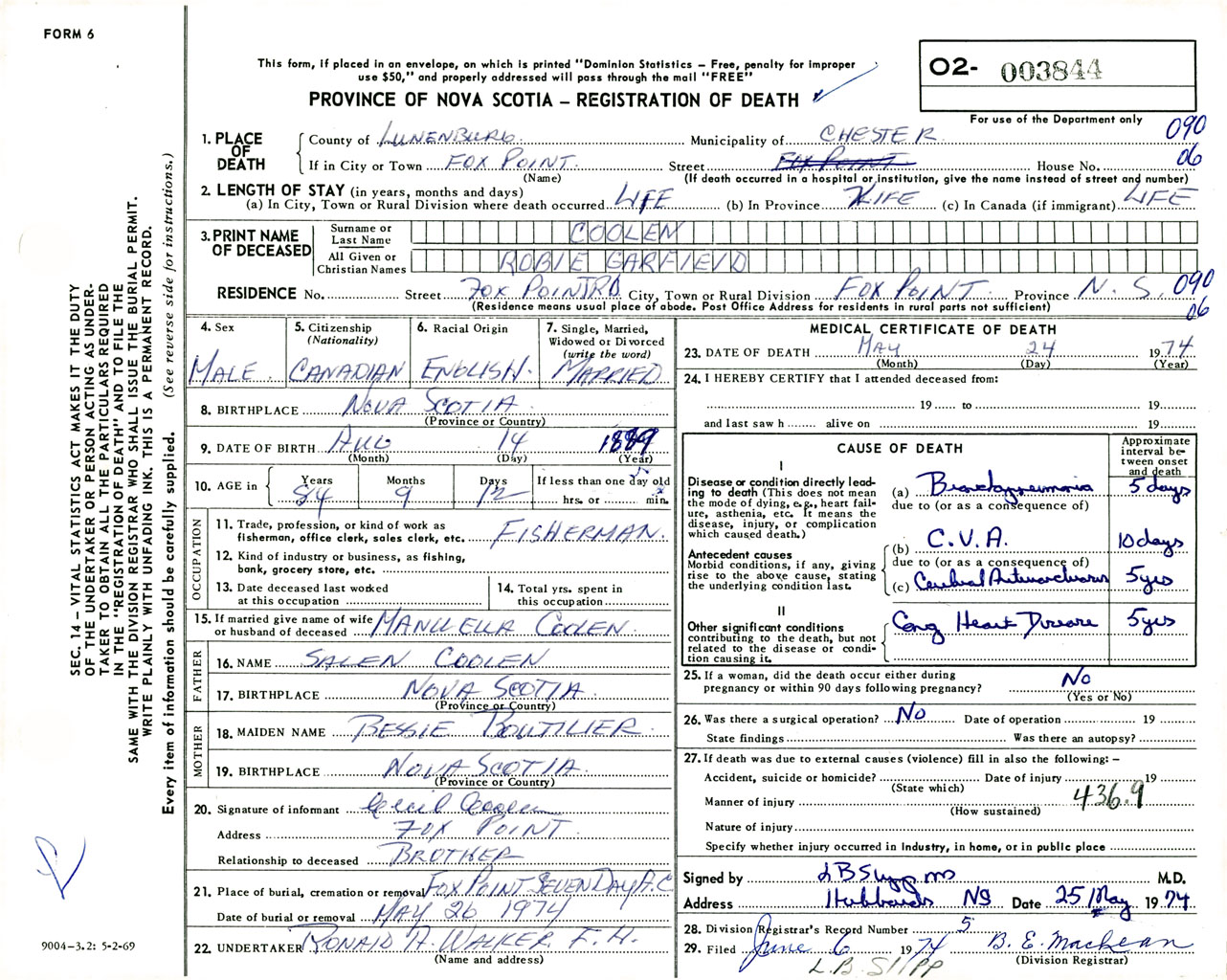 Male Death Registration: Year: 1974 number: 3844