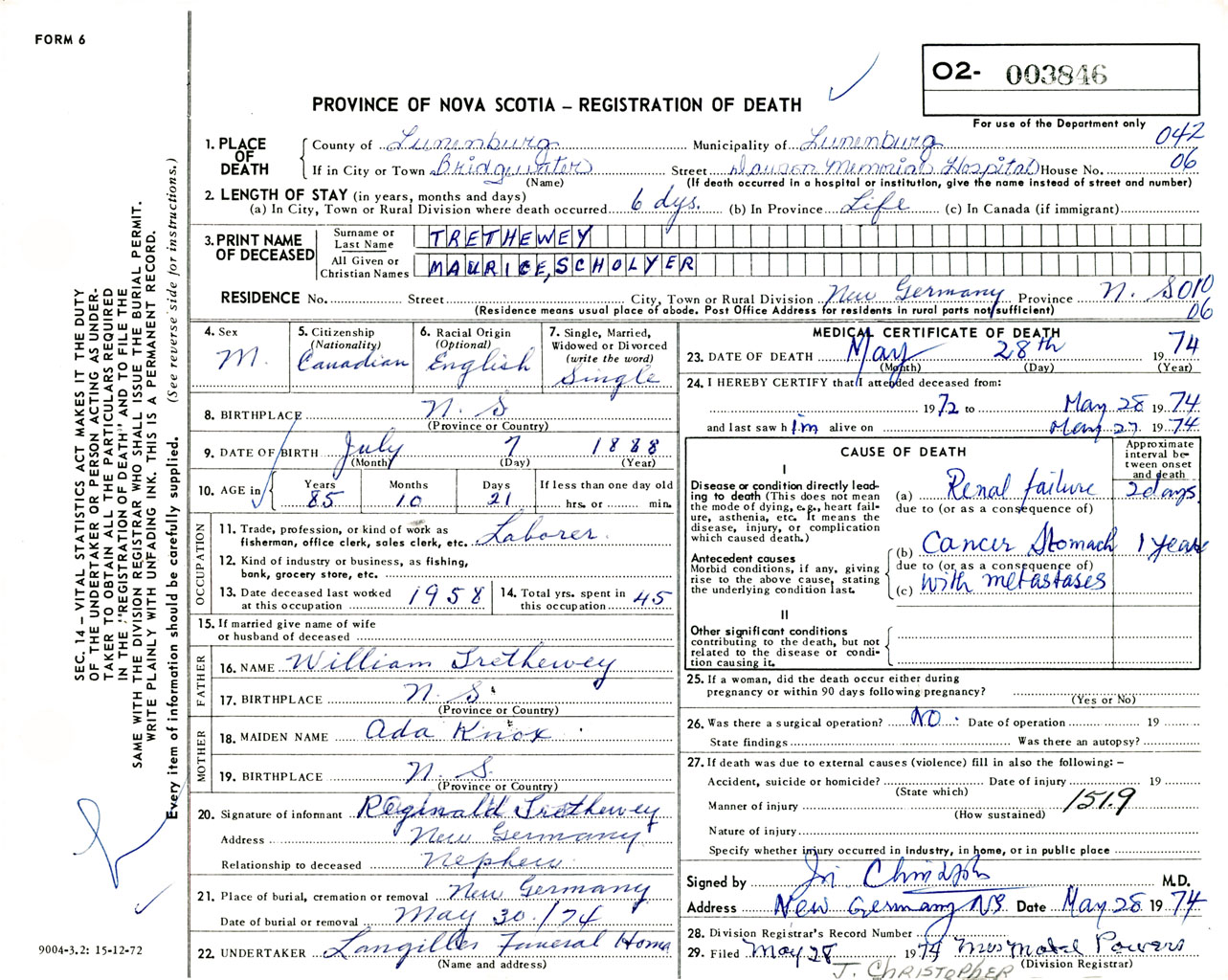 Male Death Registration: Year: 1974 number: 3846