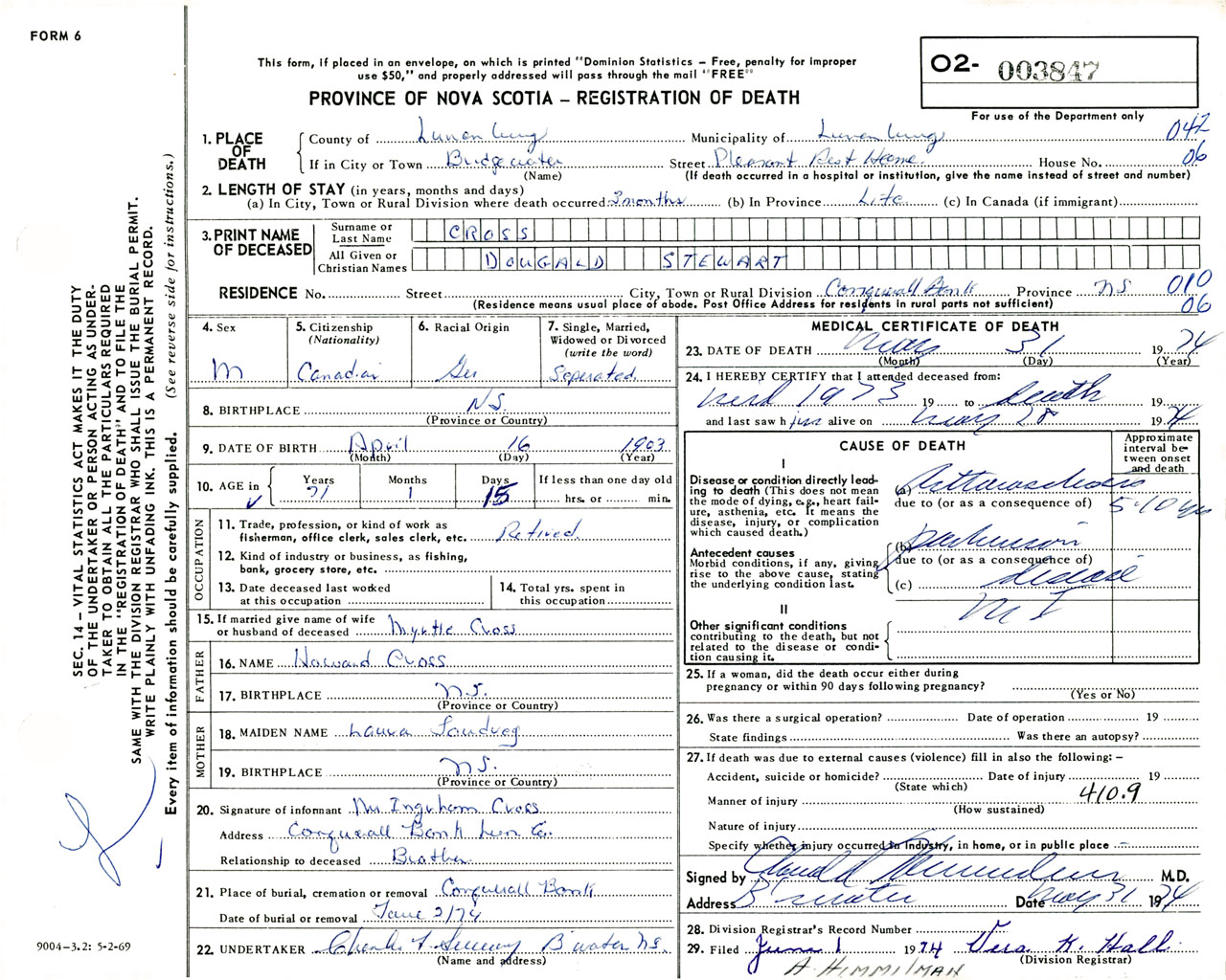 Male Death Registration: Year: 1974 number: 3847