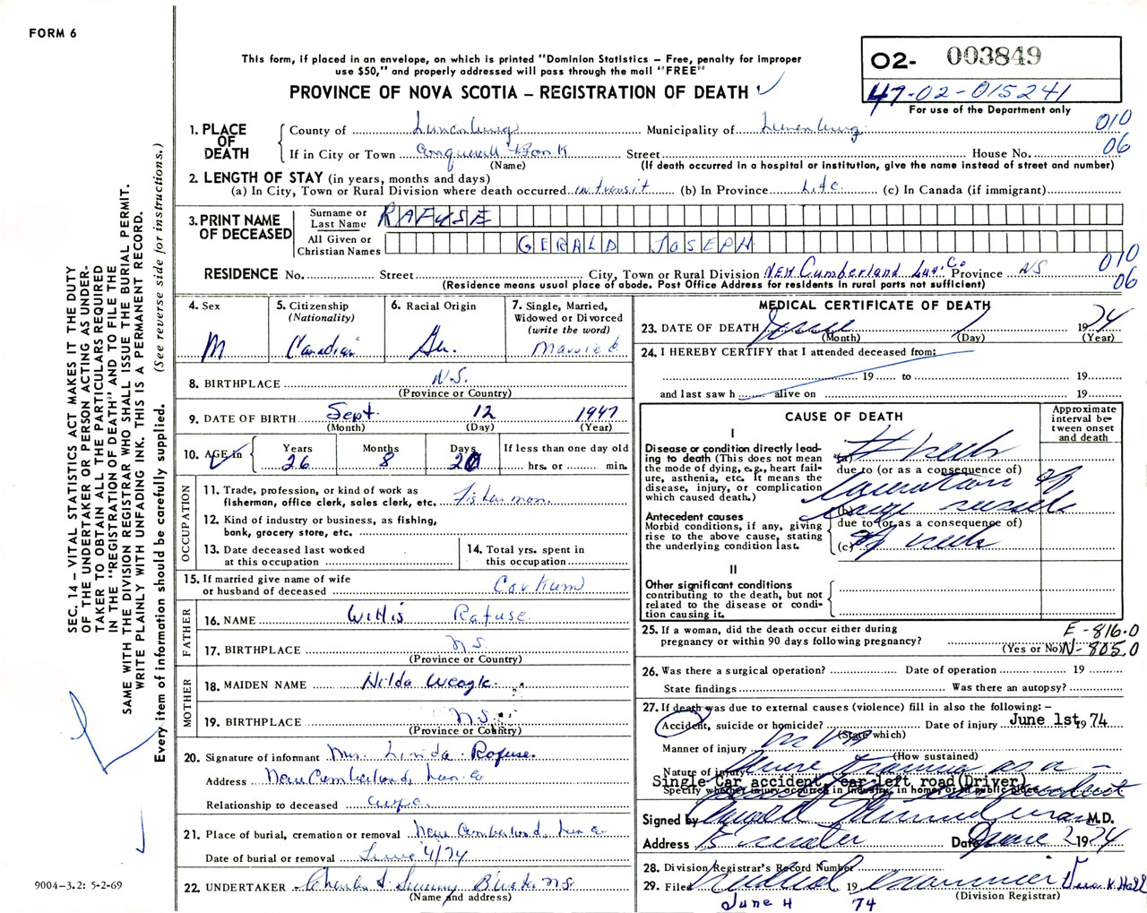 Male Death Registration: Year: 1974 number: 3849