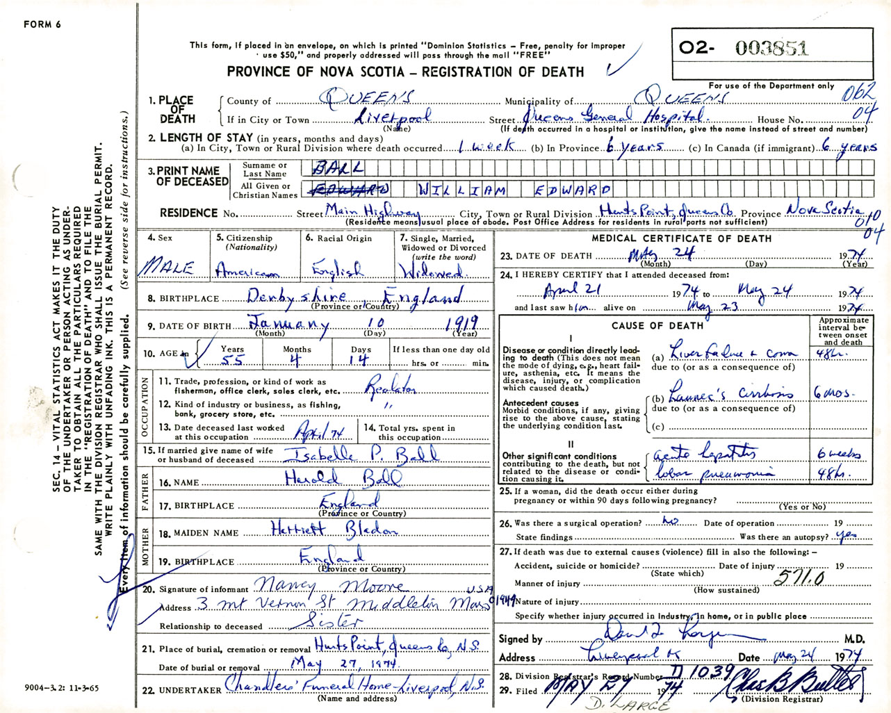 Male Death Registration: Year: 1974 number: 3851