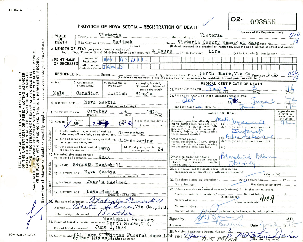 Male Death Registration: Year: 1974 number: 3856