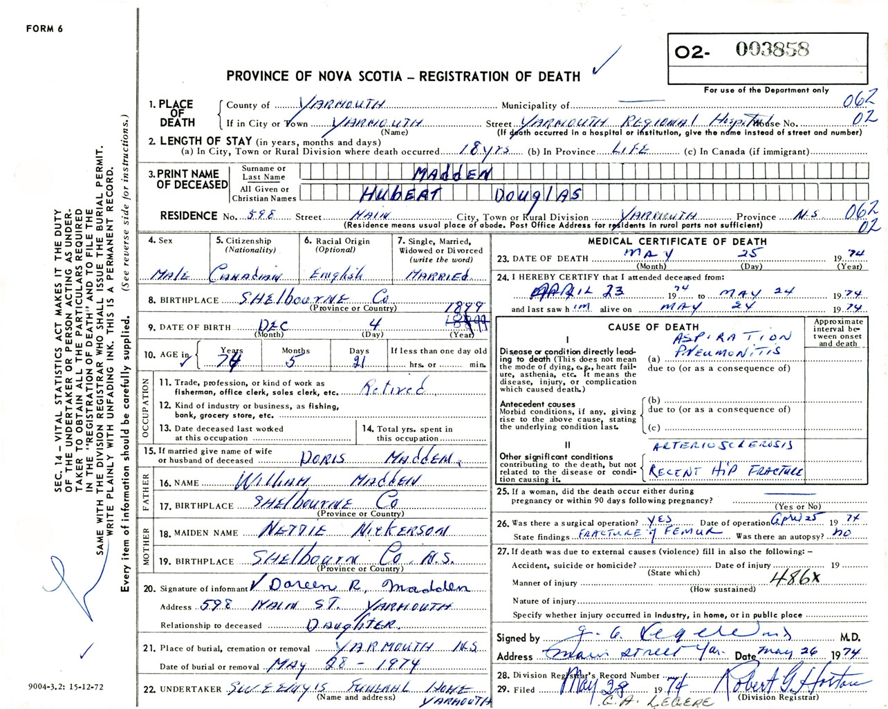Male Death Registration: Year: 1974 number: 3858