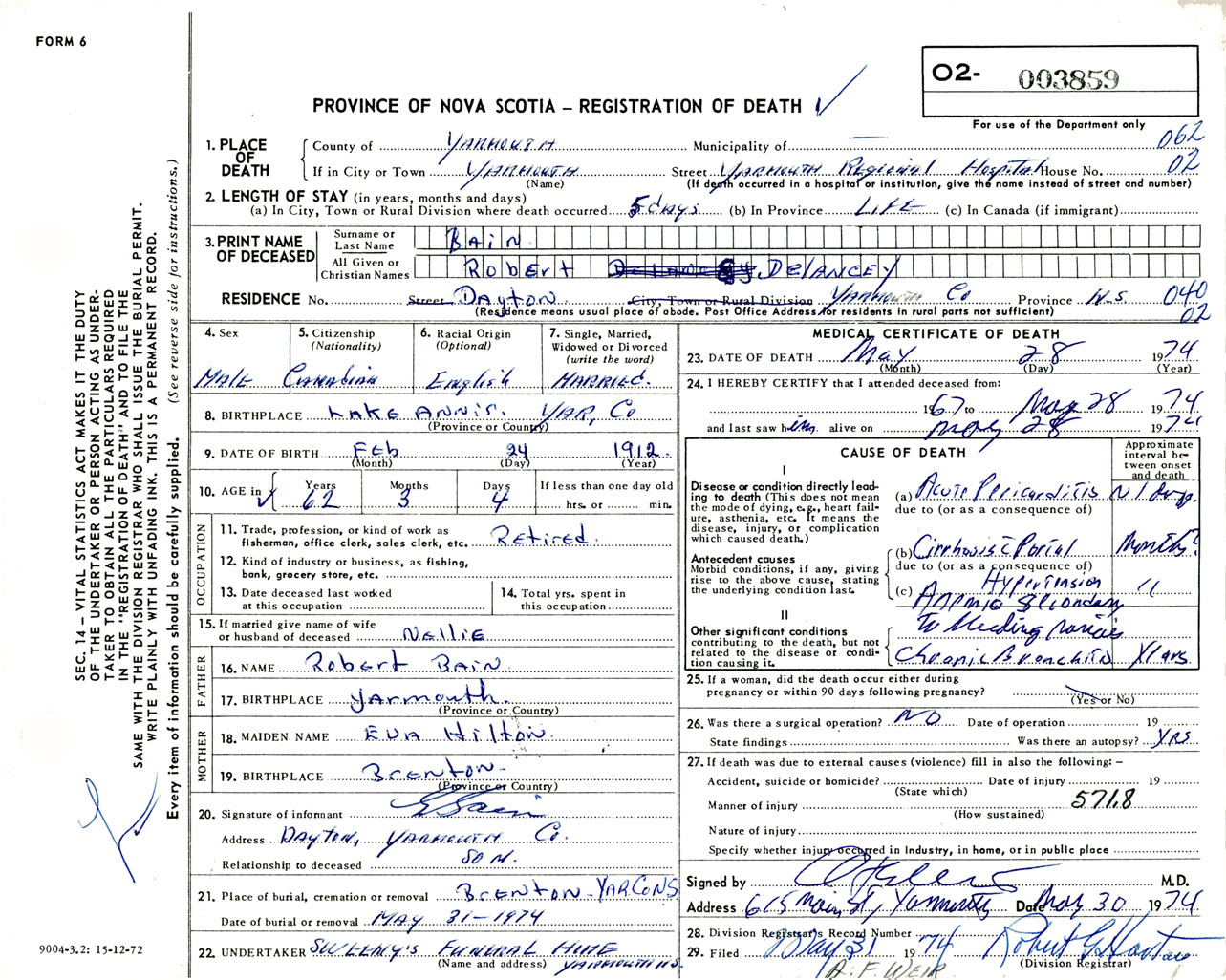 Male Death Registration: Year: 1974 number: 3859