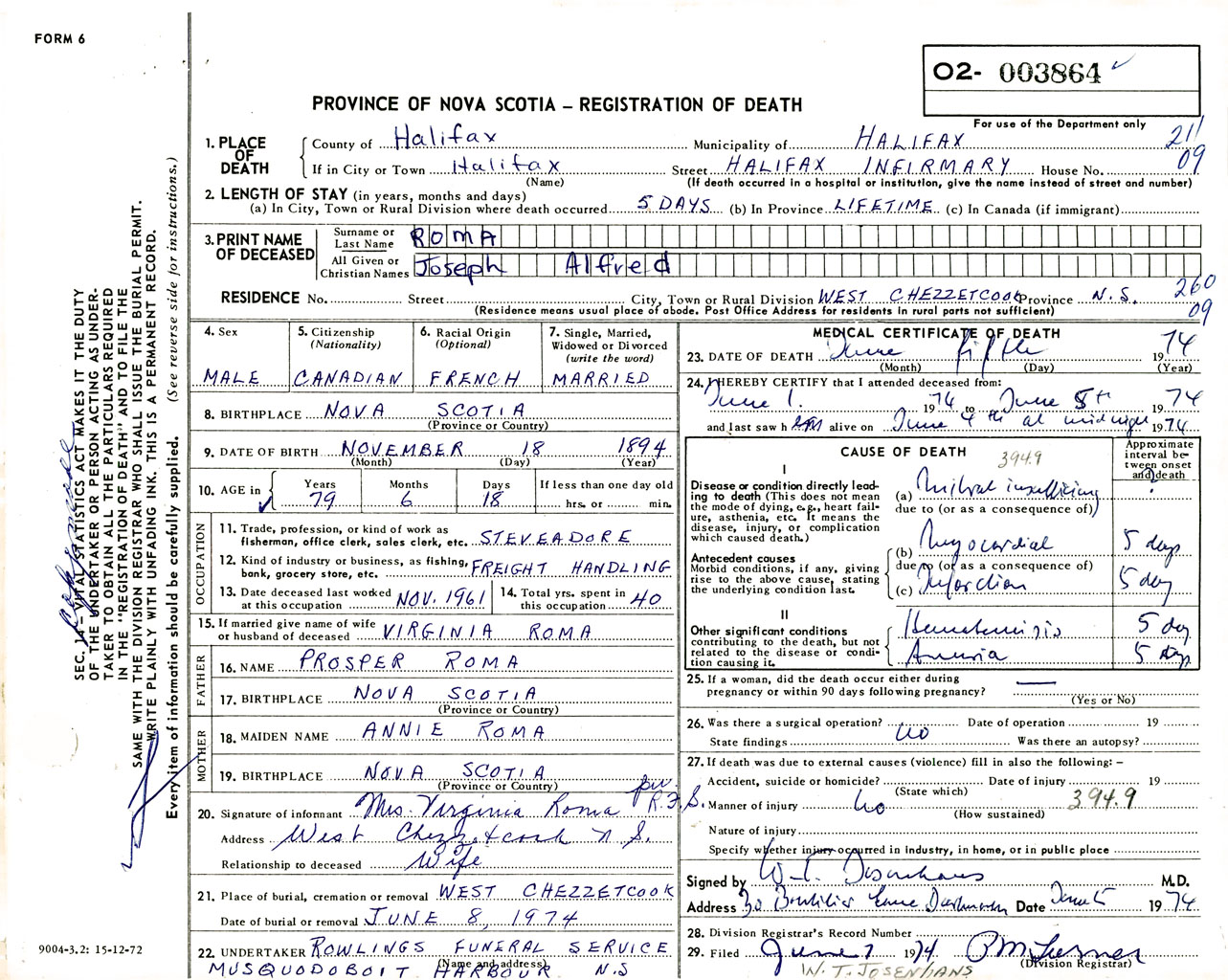 Male Death Registration: Year: 1974 number: 3864