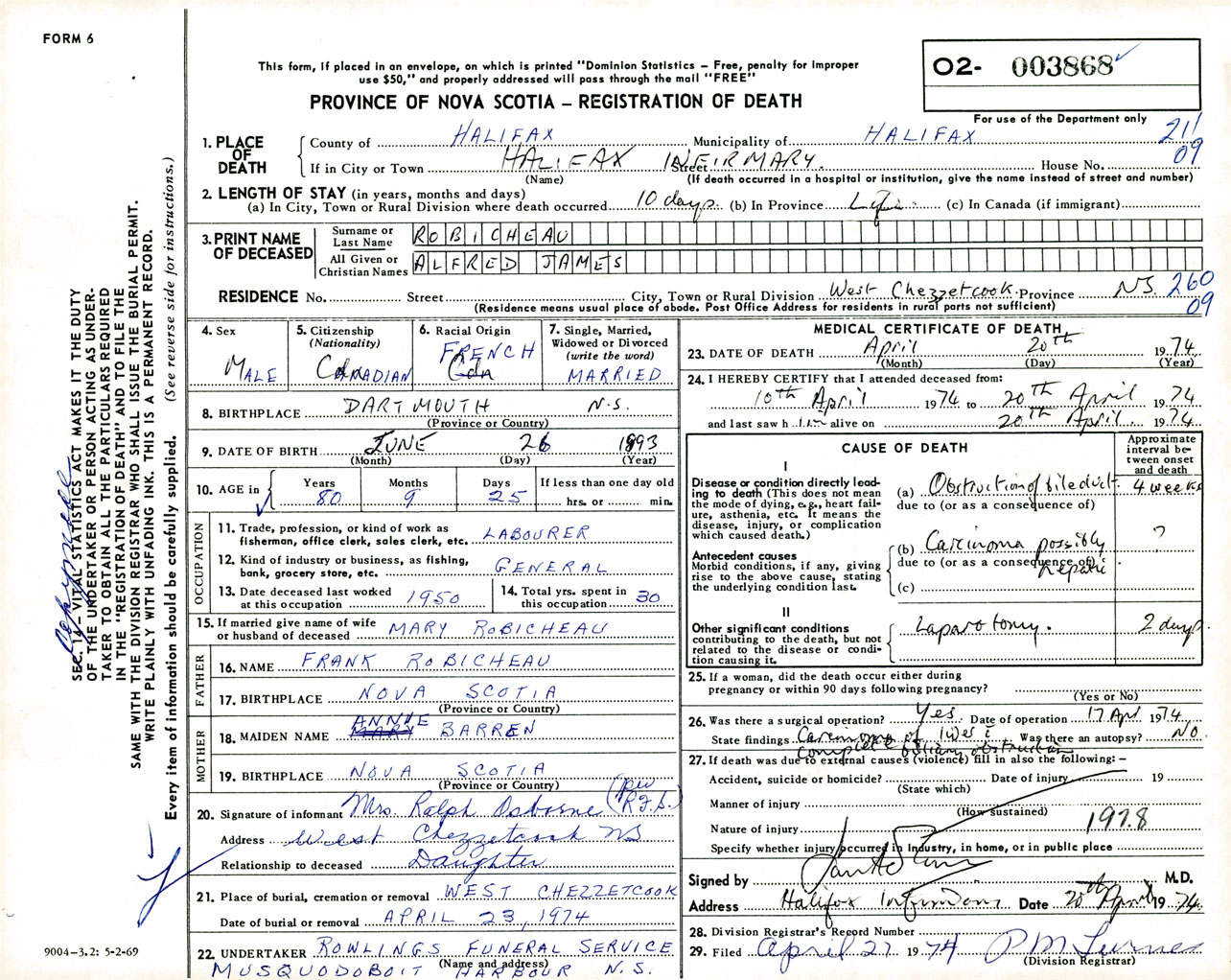 Male Death Registration: Year: 1974 number: 3868