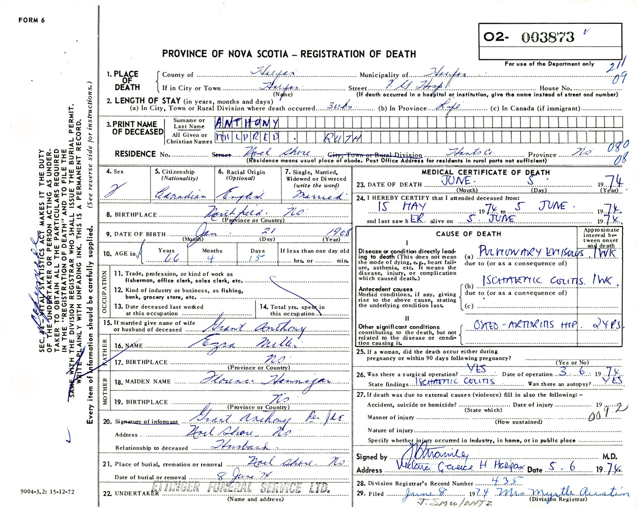 Female Death Registration: Year: 1974 number: 3873