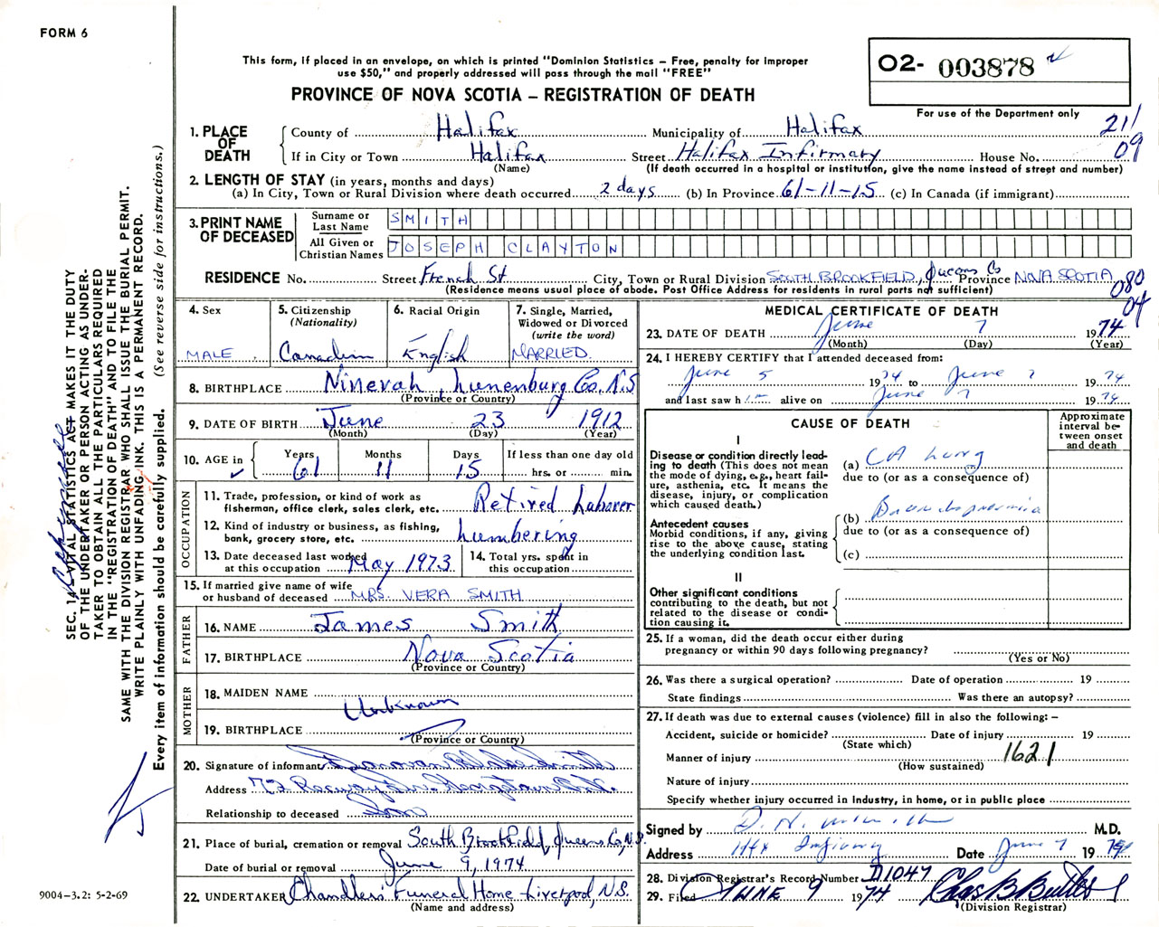 Male Death Registration: Year: 1974 number: 3878