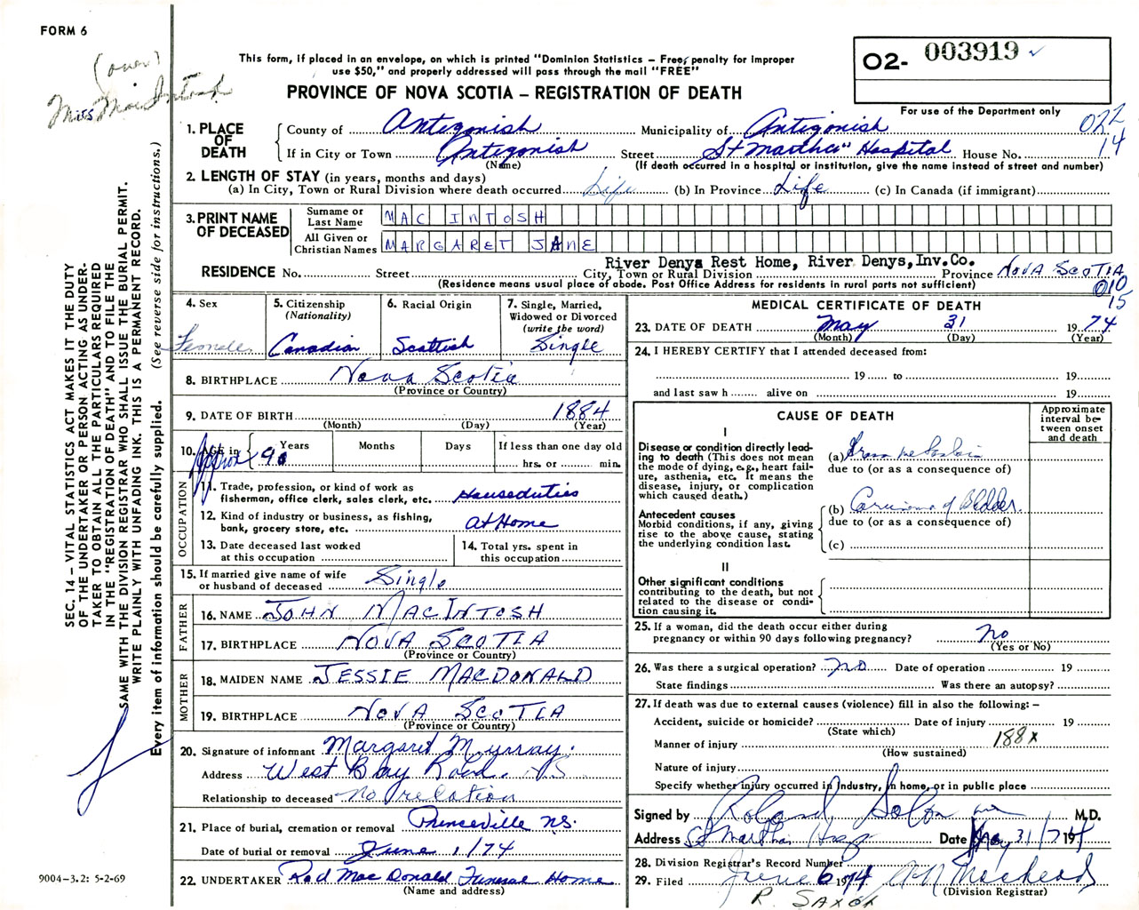 Female Death Registration: Year: 1974 number: 3919