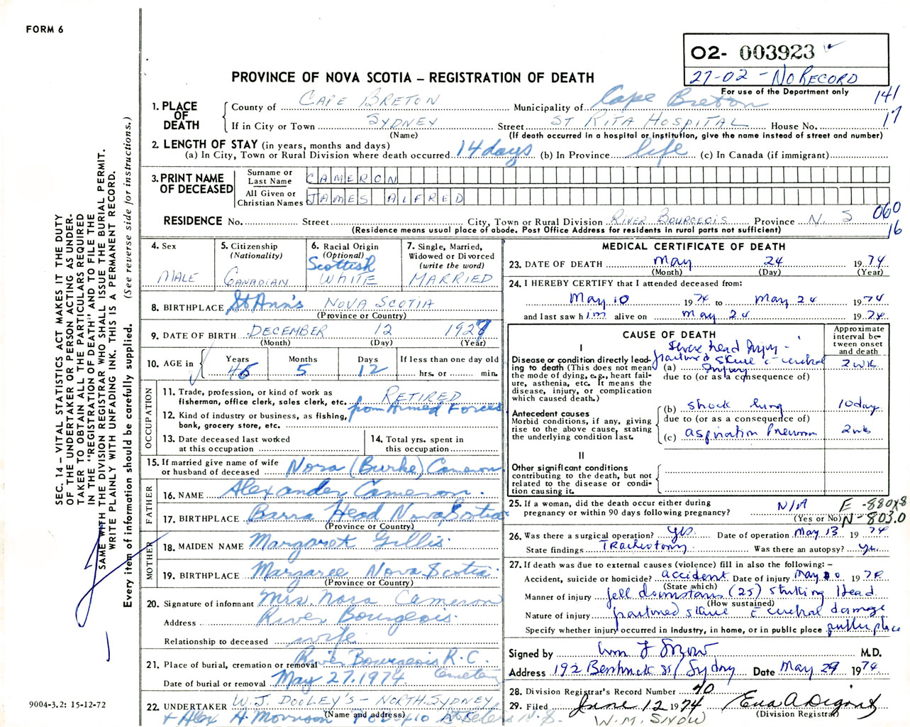 Male Death Registration: Year: 1974 number: 3923