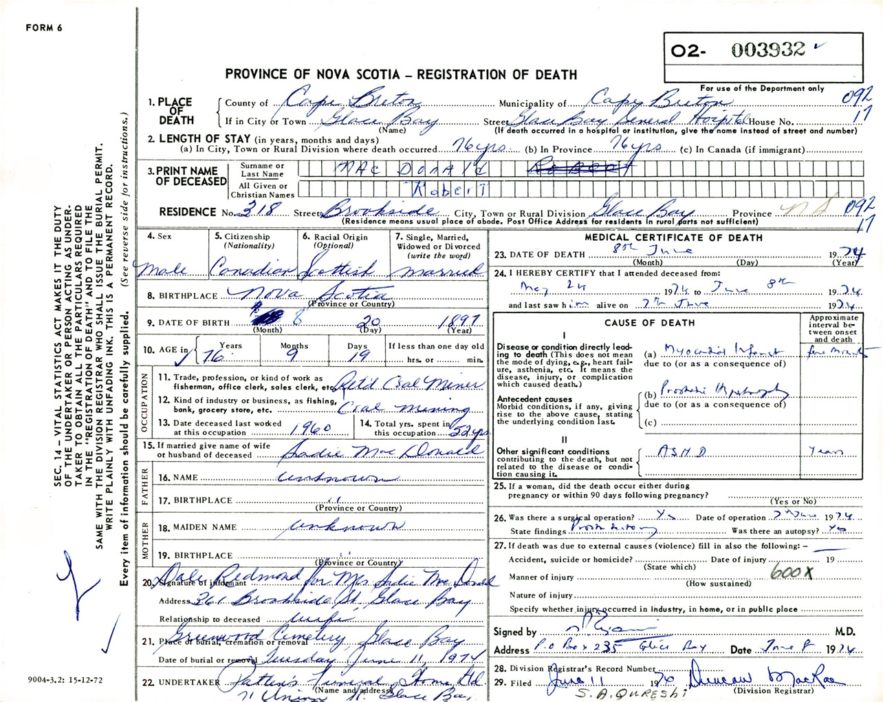 Male Death Registration: Year: 1974 number: 3932