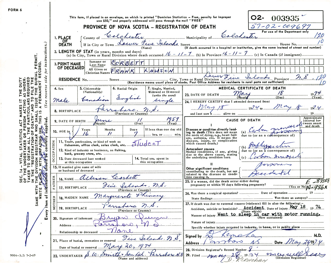 Male Death Registration: Year: 1974 number: 3935