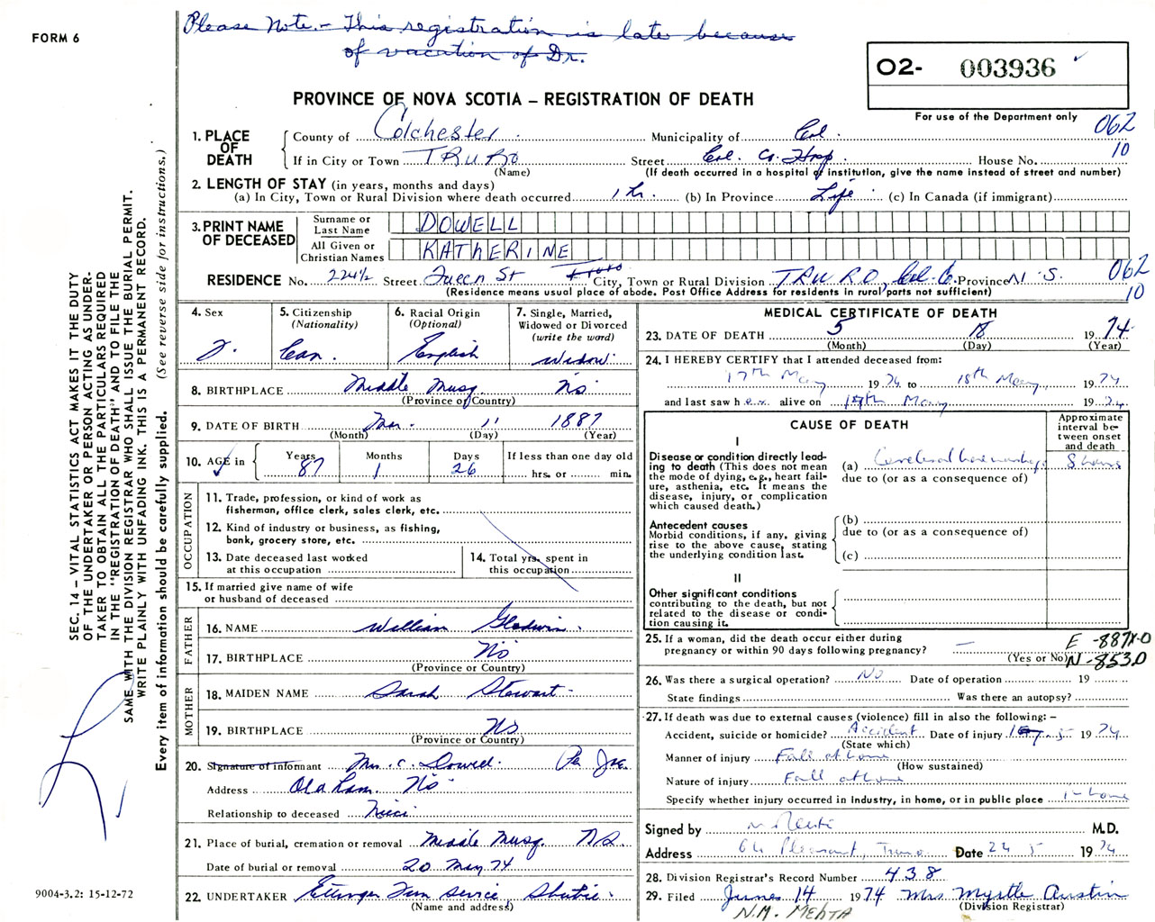 Female Death Registration: Year: 1974 number: 3936