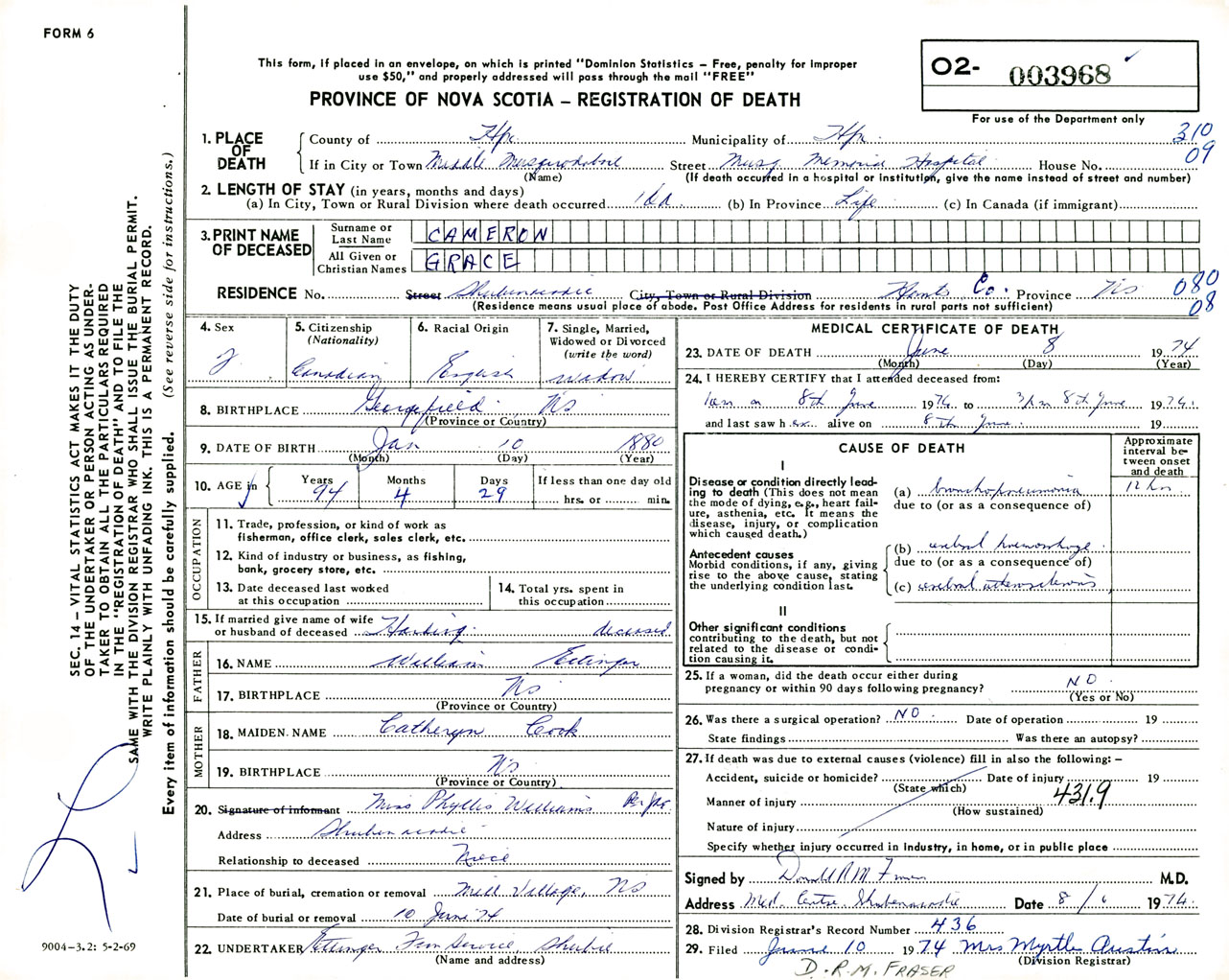 Female Death Registration: Year: 1974 number: 3968