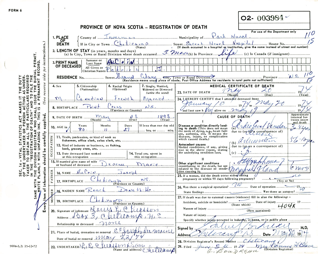 Male Death Registration: Year: 1974 number: 3984