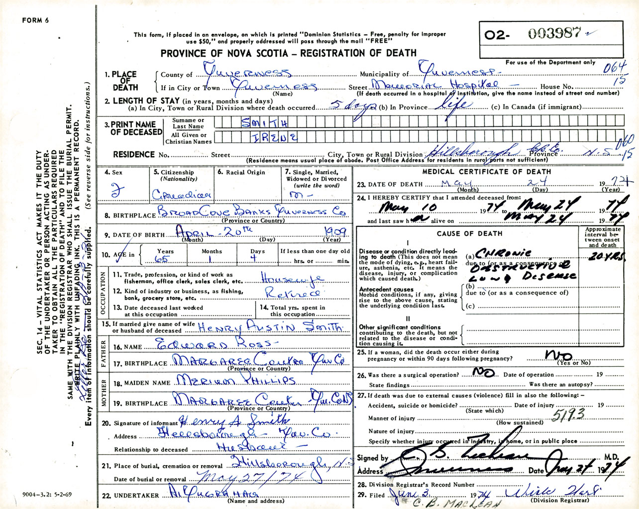 Female Death Registration: Year: 1974 number: 3987