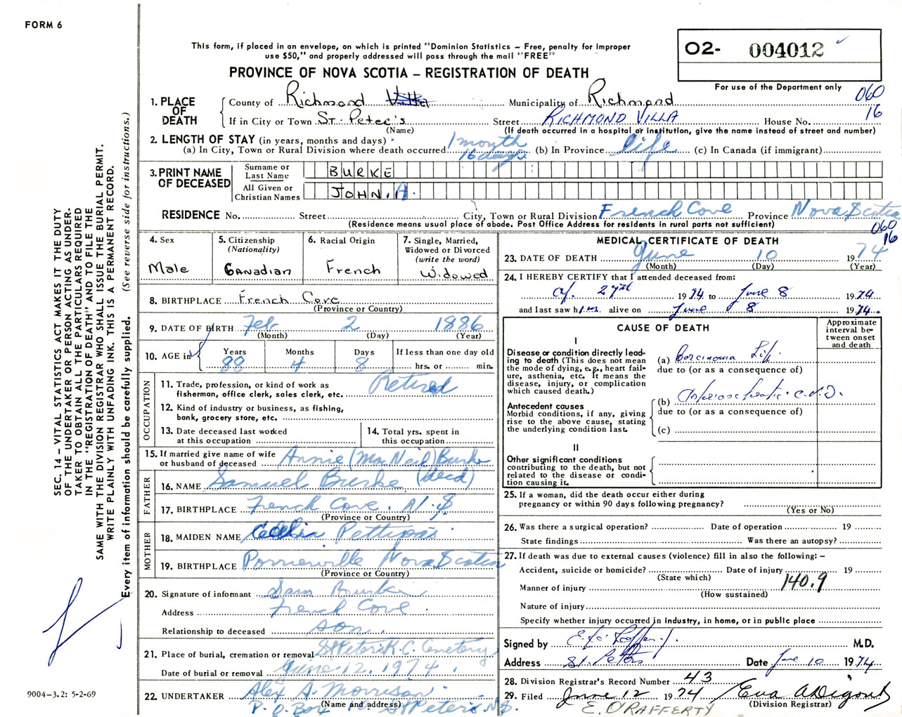 Male Death Registration: Year: 1974 number: 4012