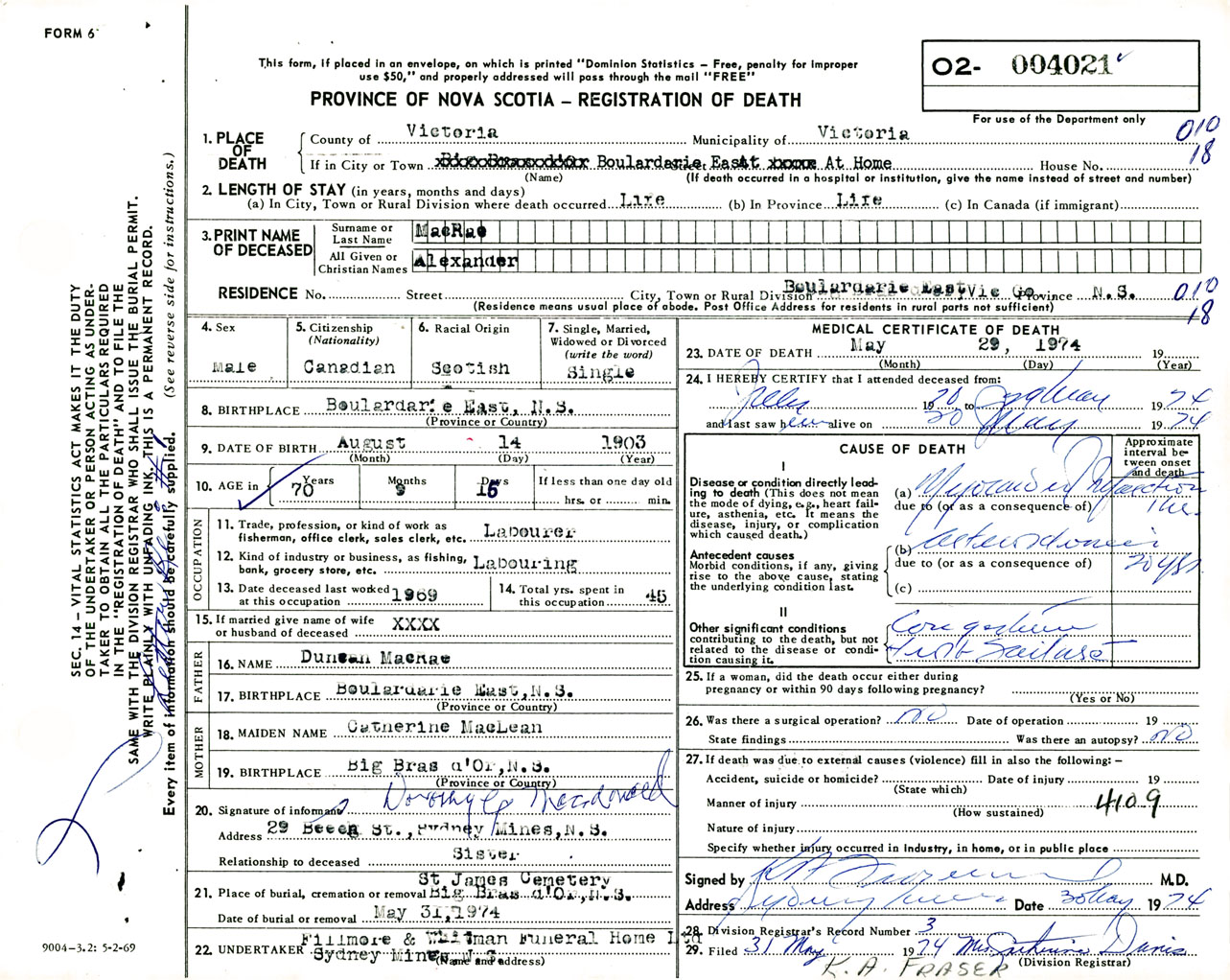 Male Death Registration: Year: 1974 number: 4021