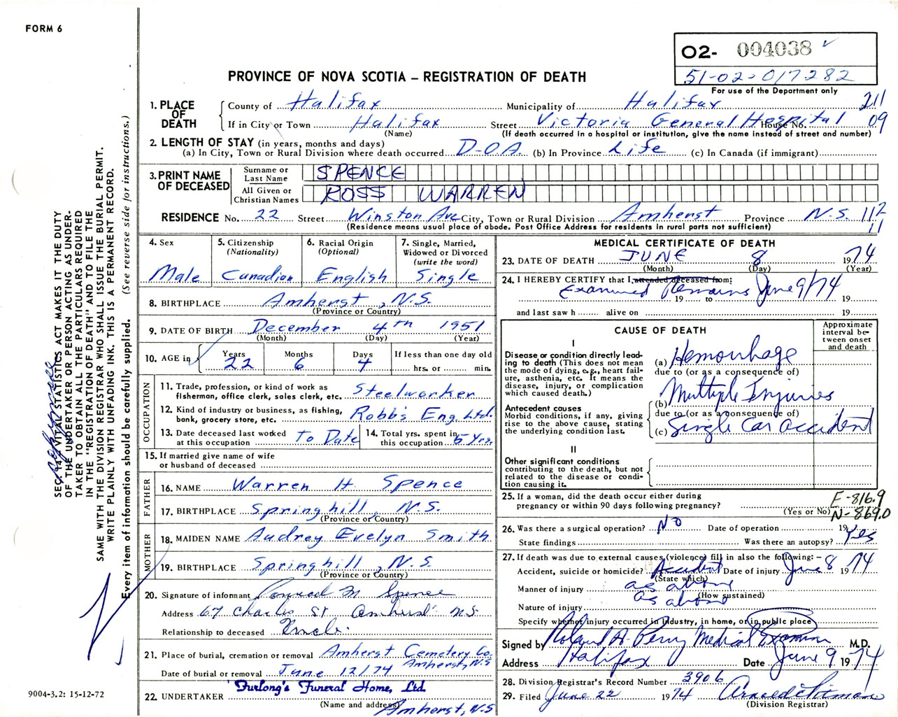 Male Death Registration: Year: 1974 number: 4038