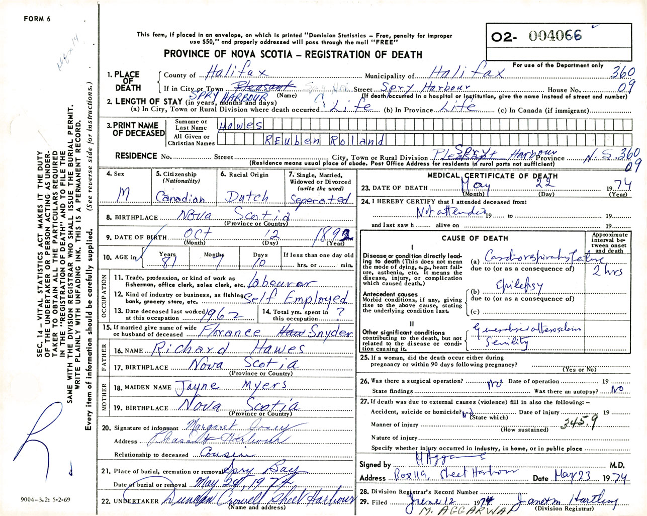 Male Death Registration: Year: 1974 number: 4066